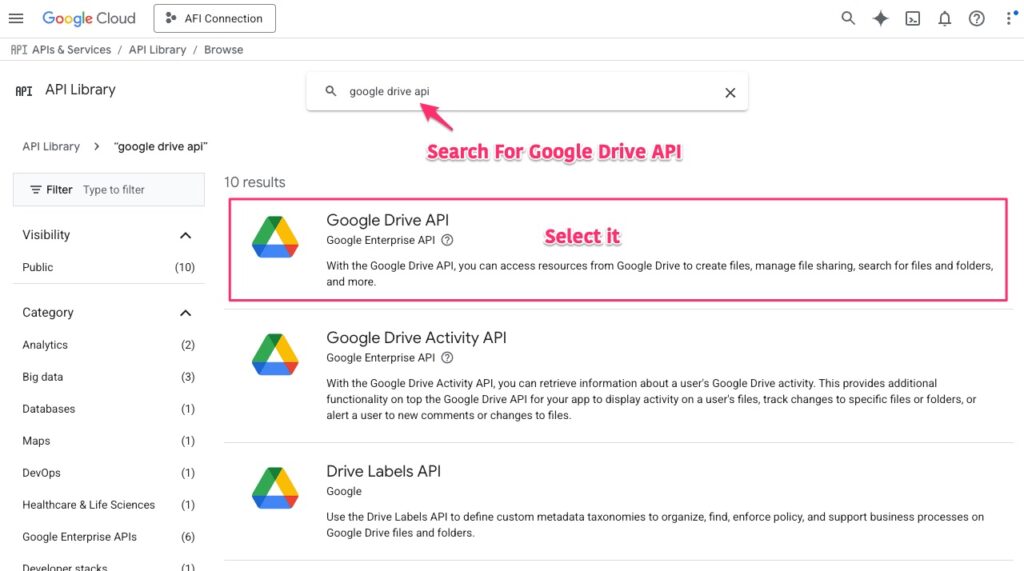 Search for Google Drive API and select it.