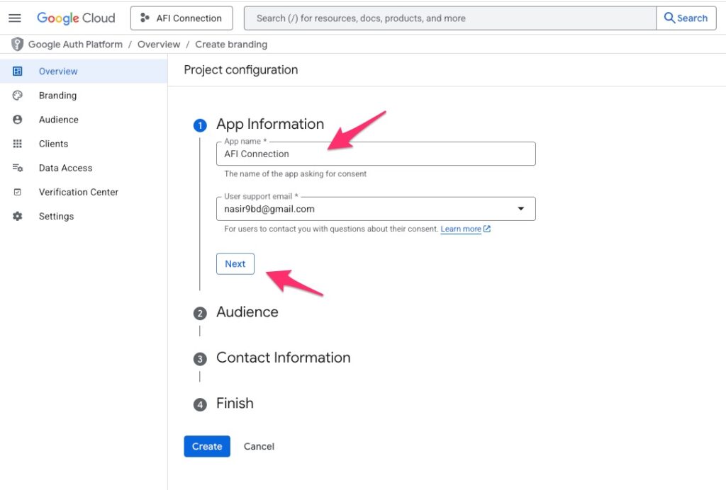 Enter an app name and your email address. Then click Next button.