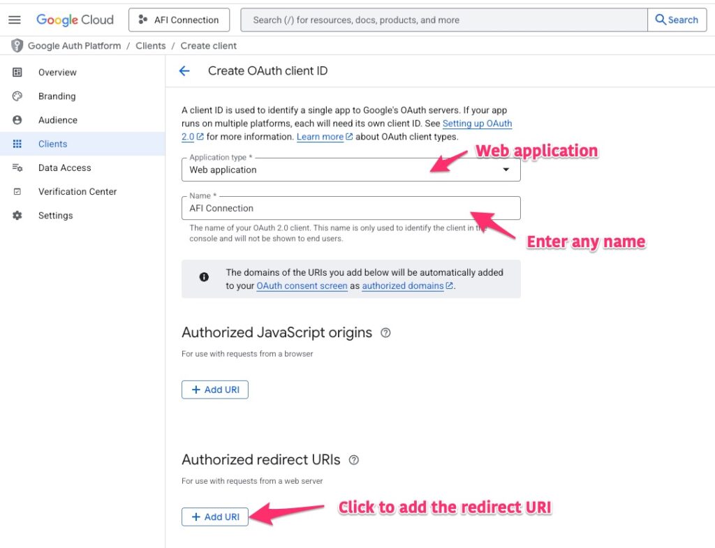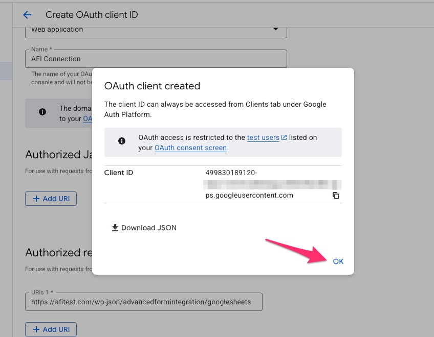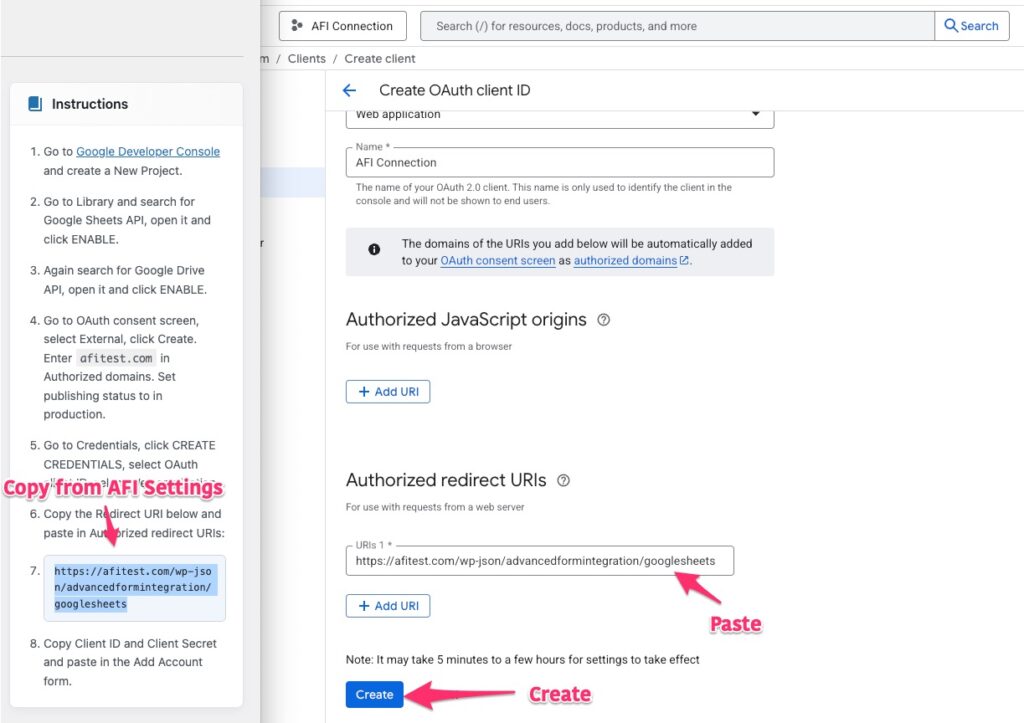 Copy the redirect URI from AFI Google Sheets settings page and paste here. Click on the Create button.