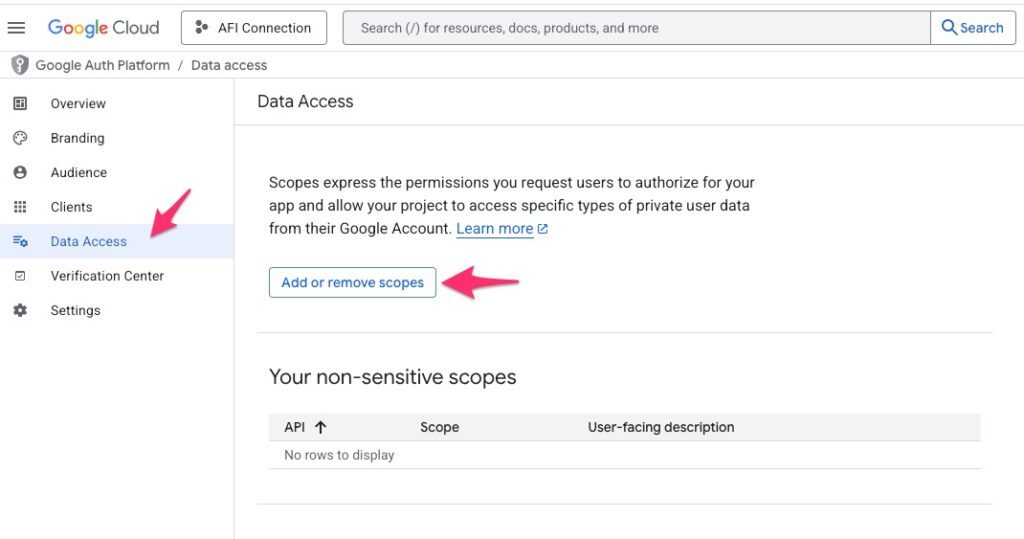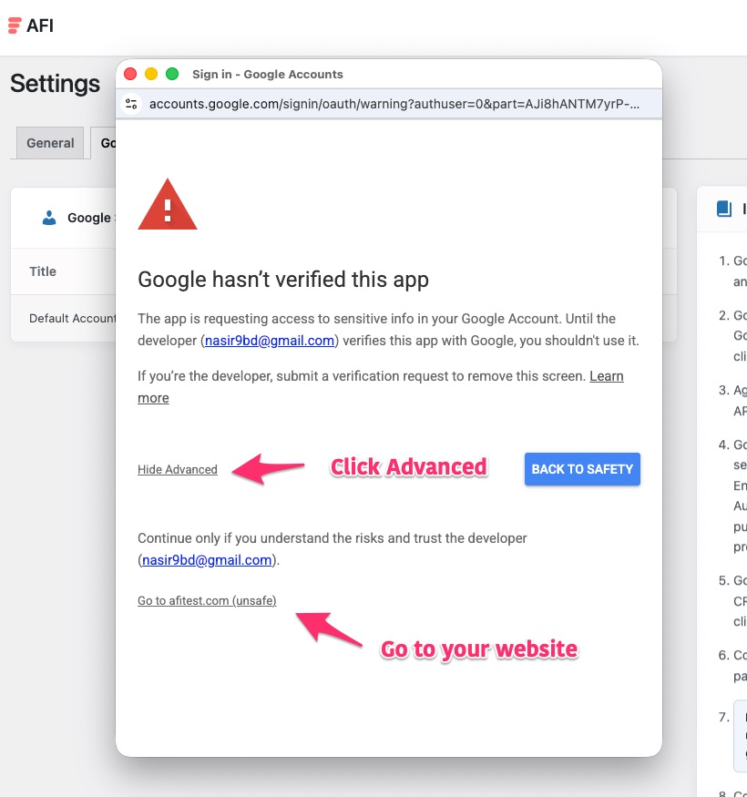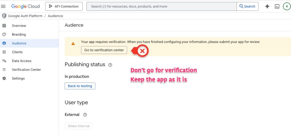 In the process of creating the app and while authorizing, you might get an unverified app warning and the system will ask you to verify the app. Usually, if using sensitive scopes, a public app is required to go through a Google verification process, when the app is intended to be used by many people. But for AFI, it is an admin plugin and you (admin) are the only user of your own app. In this case, Google support suggested to keep using it with the unverified screen. So you can just skip the verification process and use it as it is.