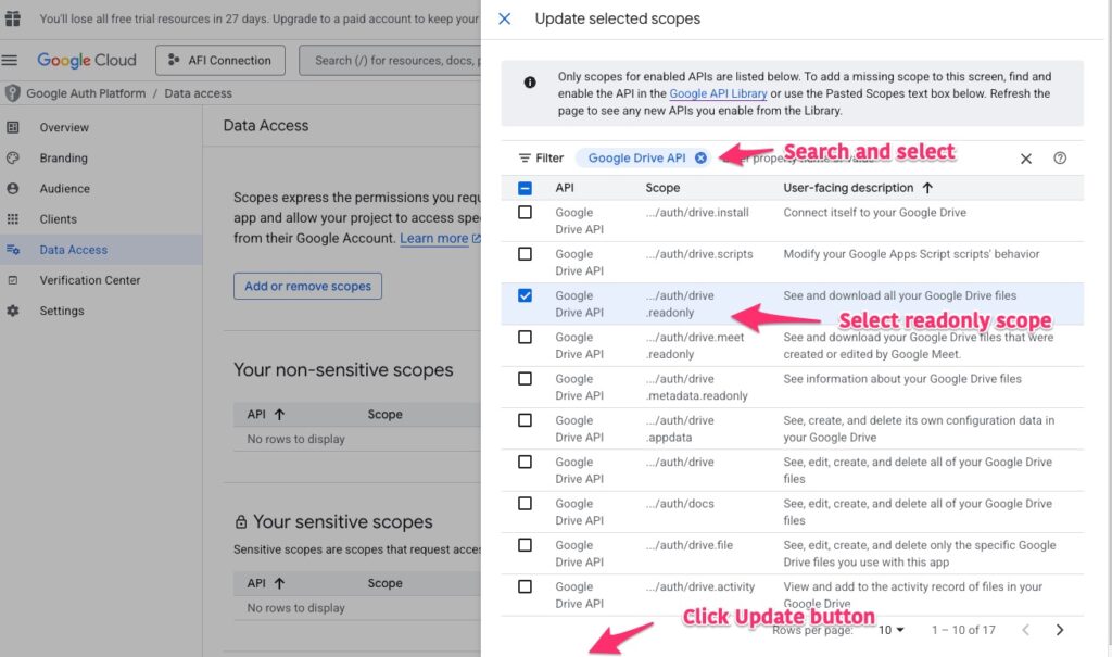 Search and select Google Drive API, mark the drive.readonly scope and click Update button.