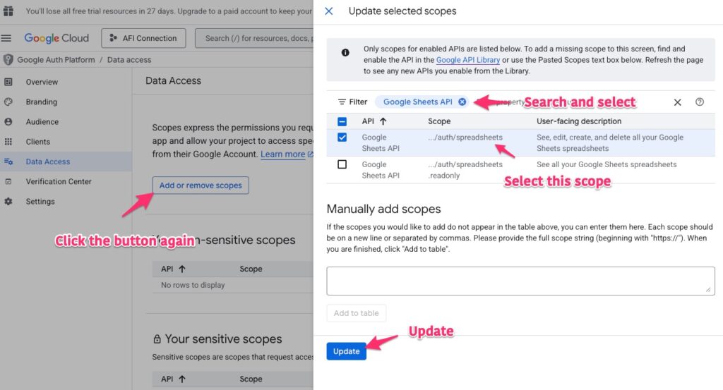 Again search and select Google Sheets API, mark spreadsheets scope and click the Update button.