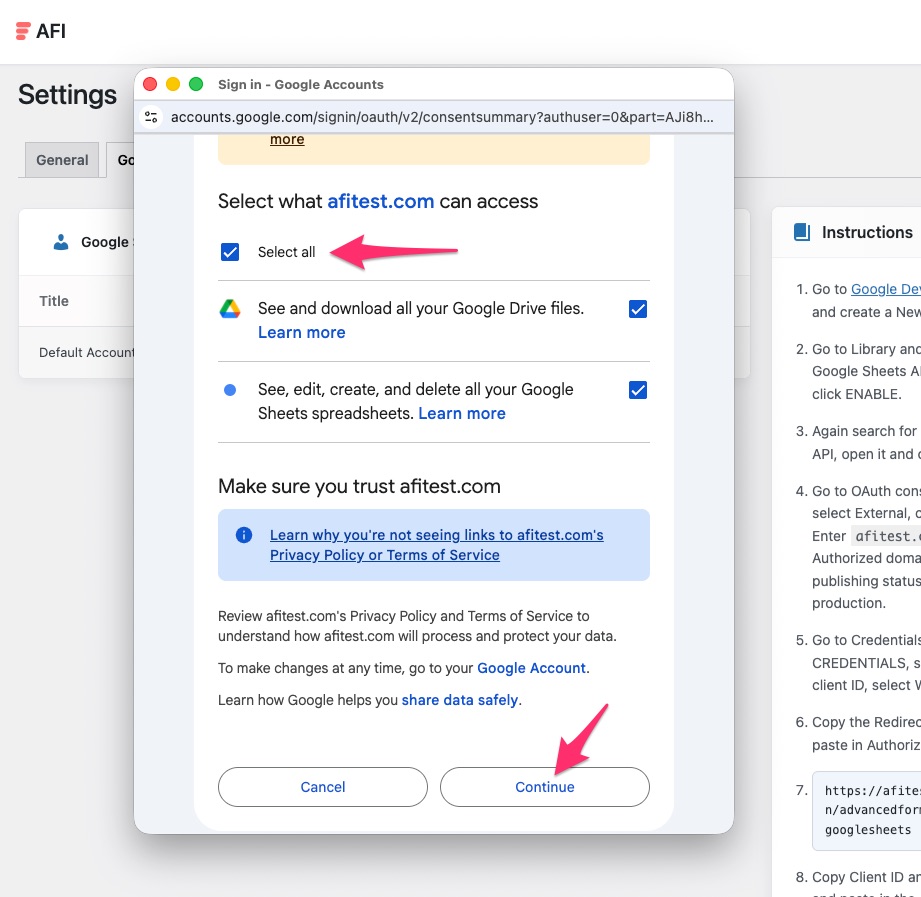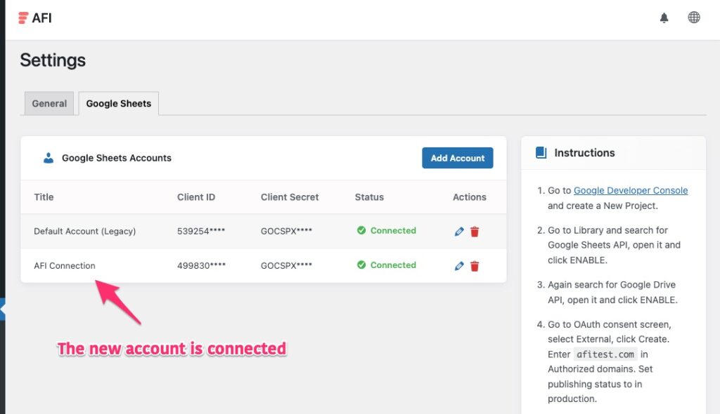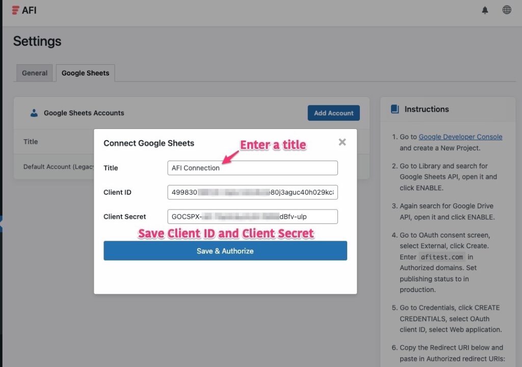 In AFI > Settings > Google Sheets, click on the Add Account button. Enter the Client ID and Client Secret. click Save & Authorize.