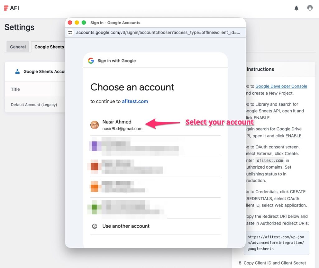 Select the Google account you want to integrate.